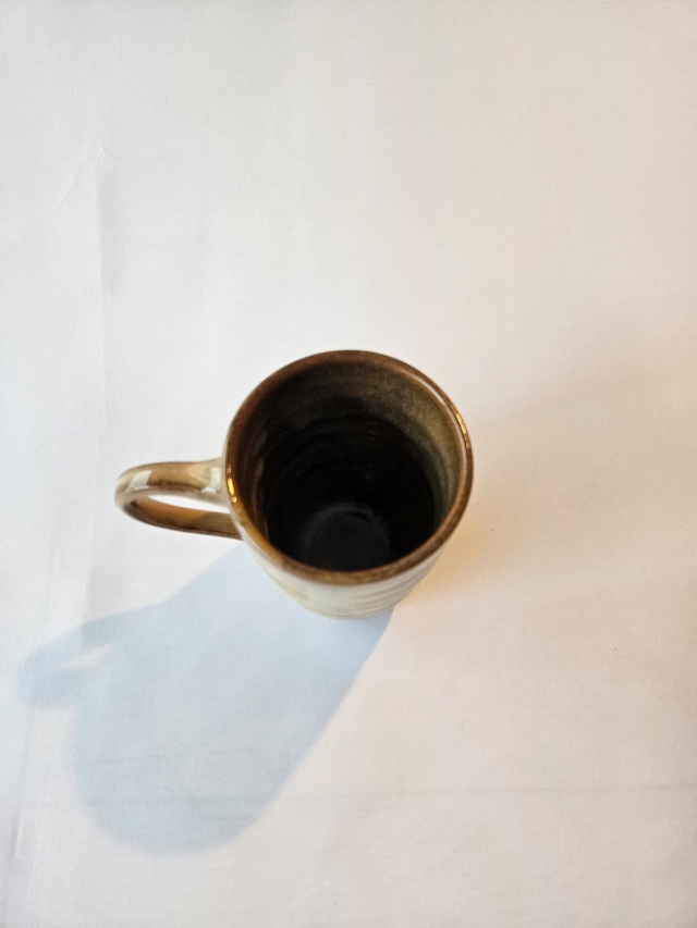 Handgedraaide keramieken mok met subtiele verticale lijnen en een warm, natuurlijk glazuur.