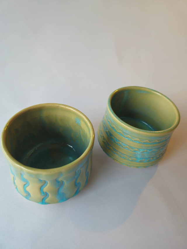 Deze handgedraaide drinkkom is afgewerkt in zachte aqua- en zandtinten die doen denken aan zee en kust.
